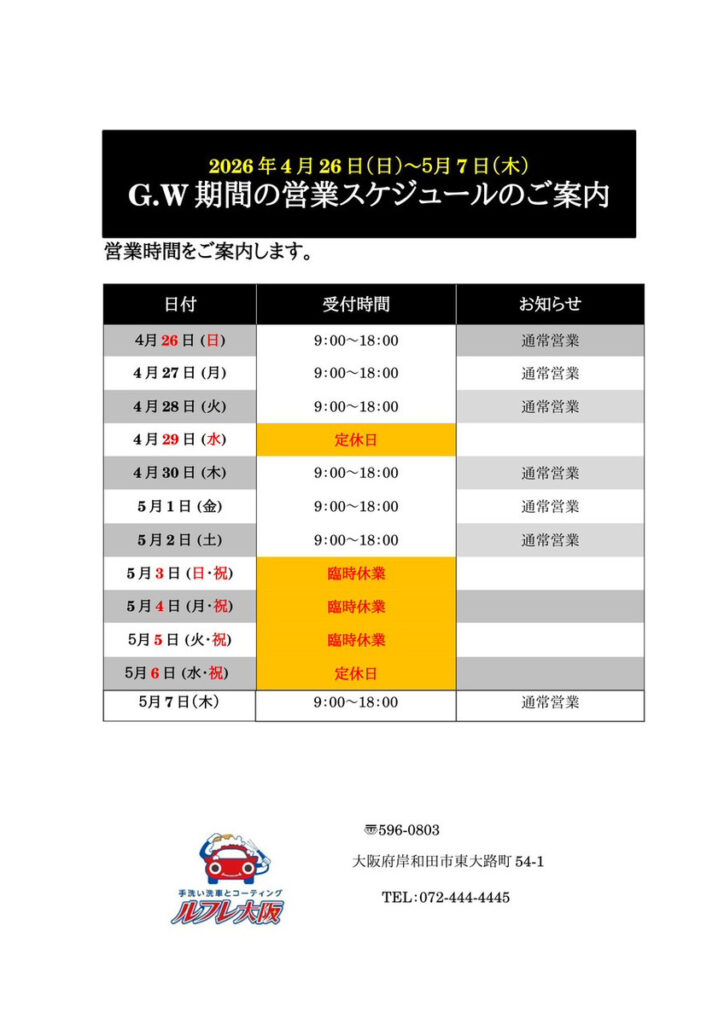 | 4月26日(日) | 通常営業 9:00〜18:00 |